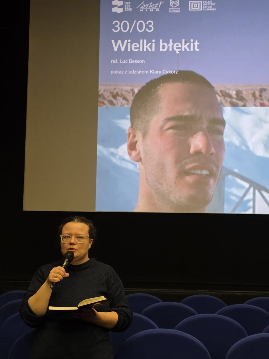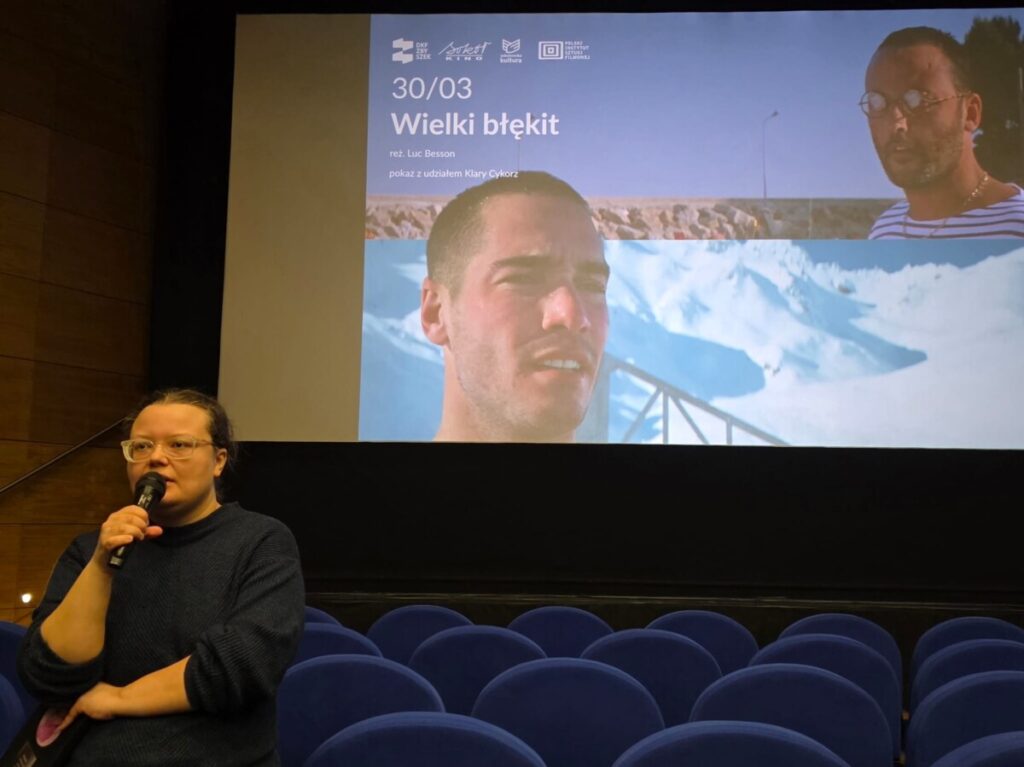 W poniedziałek, 30 marca 2026 roku, w ramach działalności Dyskusyjnego Klubu Filmowego “Zbyszek” odbył się wyjątkowy pokaz filmu “Wielki błękit” w reżyserii Luca Bessona. Wydarzeniu towarzyszyło spotkanie z filmoznawczynią Klara Cykorz, która wprowadziła widzów w kontekst dzieła oraz podjęła dyskusję po seansie.