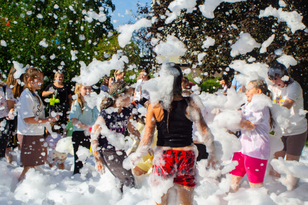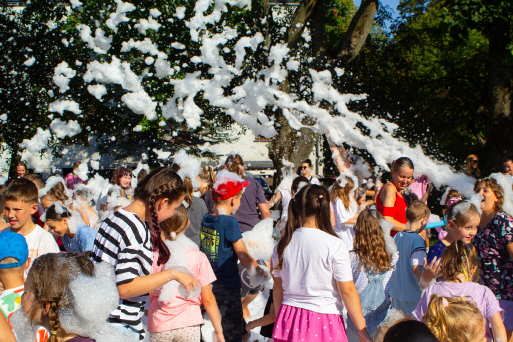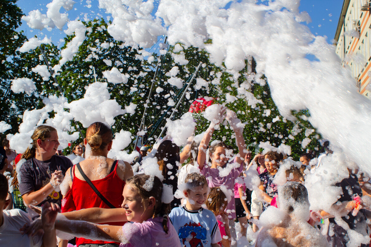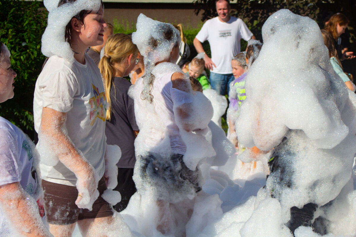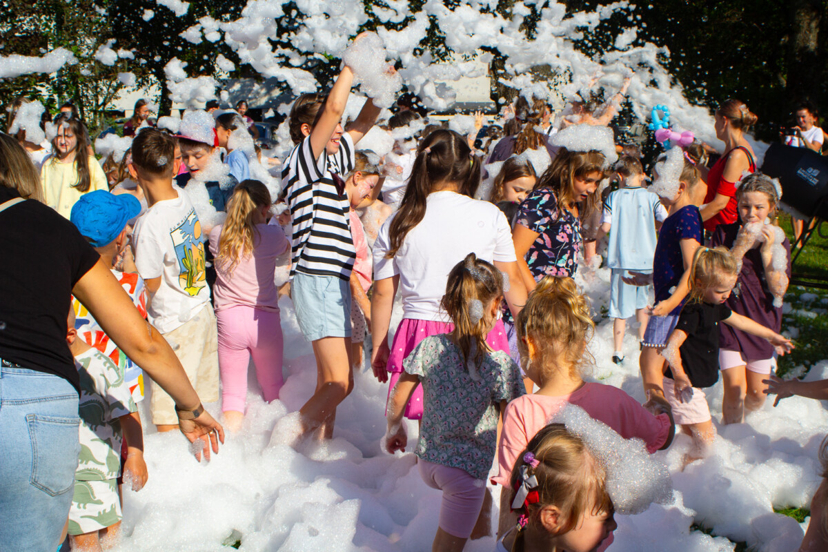 Ogromnym zainteresowaniem cieszyło się również malowanie buziek i kolorowe tatuaże, które sprawiły, że dzieci na chwilę mogły wcielić się w bajkowe postacie. Nie zabrakło także pysznego grilla, a punktem kulminacyjnym była uwielbiana przez najmłodszych piana party, która zamieniła plac w szaloną strefę zabawy.